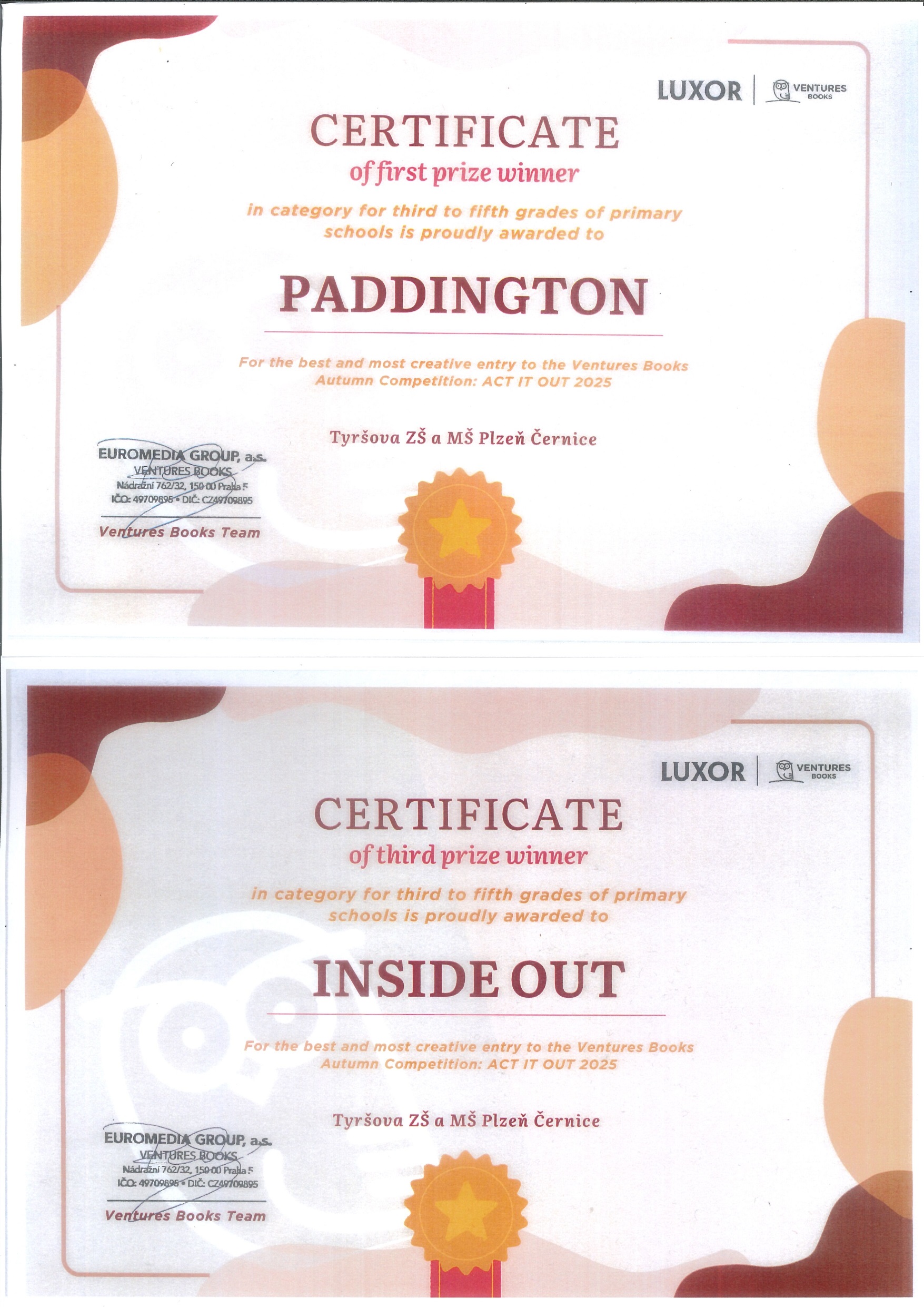 Členové Klubu anglického jazyka z 4.a 5. tříd natáčeli filmy v angličtině do soutěže ACT IT OUT pořádanou LUXOR Ventures Books. 4. třída se s filmem Inside Out umístila na 3. místě a zvítězila s filmem Paddington. Všem patří velká pochvala a gratulace!!!